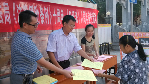 2013年8月29日早上8点至12点,在我局组织下,我公证处与我局法律援助中心在平乐县中山公园门前,开展了《公证法》、《法律援助条列》的宣传活动。参加此宣传活动的有局党组书记廖首升、副局长唐华、纪检组长黄刚、公证处全体人员、法律援助中心主任杨福正。此次宣传活动发放宣传材料500余份,接待公证法律咨询100多人次,使我县群众对《公证法》有了进一步的认识。