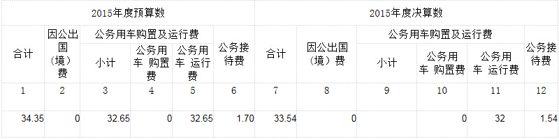 2015年度一般公共预算财政拨款安排的“三公”经费支出决算中,因公出国(境)费支出决算0万元;公务用车购置及运行费支出决算32万元;公务接待费支出决算1.54万元。具体情况如下: