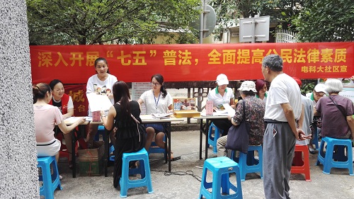 十九大召开前夕,为确保“十九大”召开期间的安全稳定、进一步增强群众特别是青少年儿童的法律意识和法制观念,营造良好法治氛围,10月11日上午,电科大社区在六合路82号门球场附近开展了主题为“深入开展‘七五’普法,全面提高公民法律素质”宣传活动。